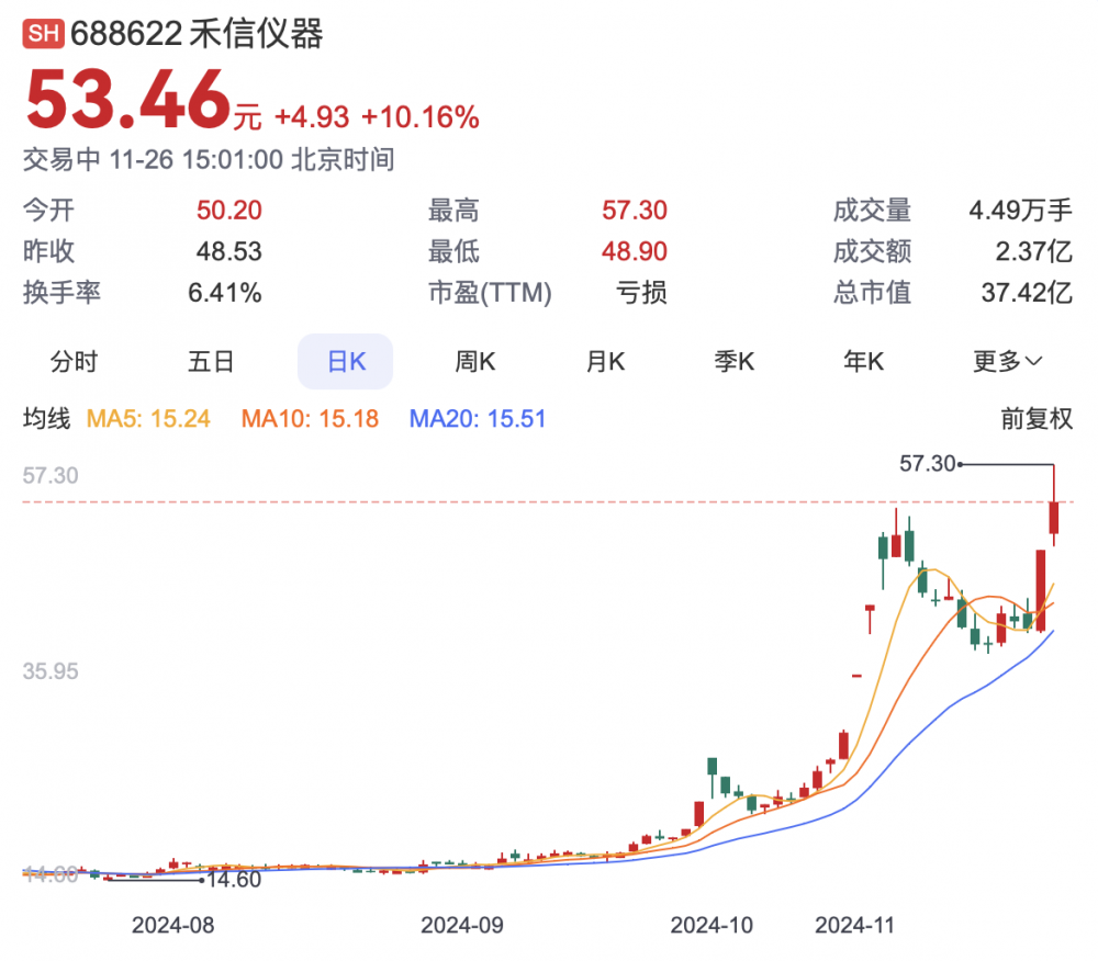 今日,禾信仪器股价盘中再创阶段新高,截止发稿上涨10.16%,最新市值37.42亿元。