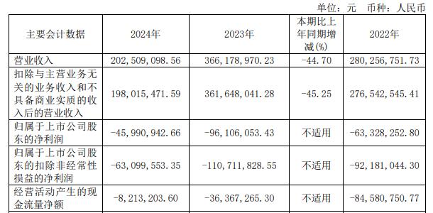 禾信仪器(688622.SH)近日发布的2024年年度报告显示,2024年公司实现营业收入2.03亿元,同比下降44.70%;实现归属于上市公司股东的净利润-4599.09万元,上年同期为-9610.61万元;实现归属于上市公司股东的扣除非经常性损益的净利润-6309.96万元,上年同期为-1.11亿元;经营活动产生的现金流量净额-821.32万元,去年同期为-3636.73万元。