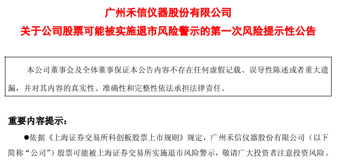1月31日,禾信仪器(688622)披露关于公司股票可能被实施退市风险警示的第一次风险提示性公告。公告称,依据《上海证券交易所科创板股票上市规则》规定,公司股票可能被上海证券交易所实施退市风险警示,敬请广大投资者注意投资风险。