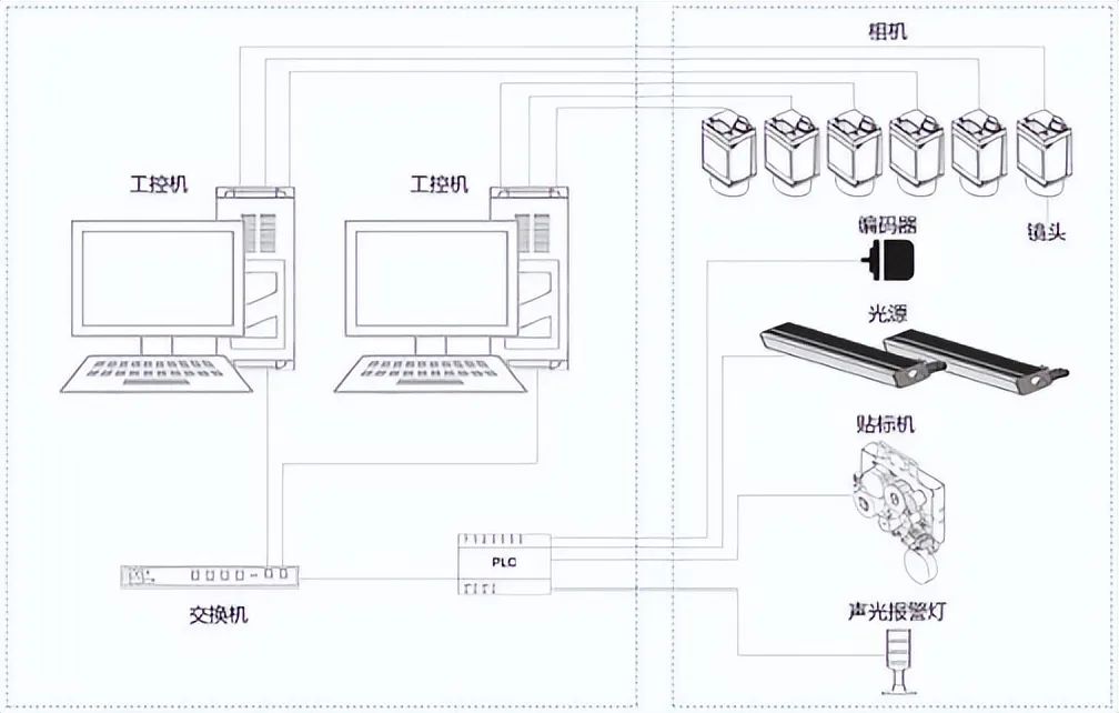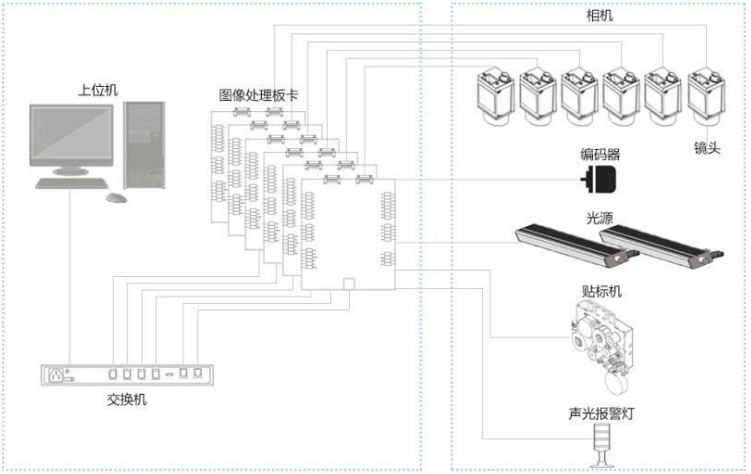 具体来看产品端,WIS视觉检测系统是基于FPGA图像处理的视觉检测系统,由光源、镜头、CameraLink接口的工业线阵相机(以下简称“CameraLink相机”)、图像处理板卡、交换机、上位机(工作站)等构成。工作原理如下图所示:
