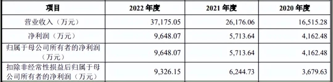 2020年-2022年,双元科技营业收入分别为1.65亿元、2.62亿元、3.72亿元;归母净利润分别为0.42亿元、0.57亿元、0.96亿元;扣非归母净利润分别为0.37亿元、0.62亿元、0.93亿元。双元科技连续三年实现营收和归母净利均正增长。