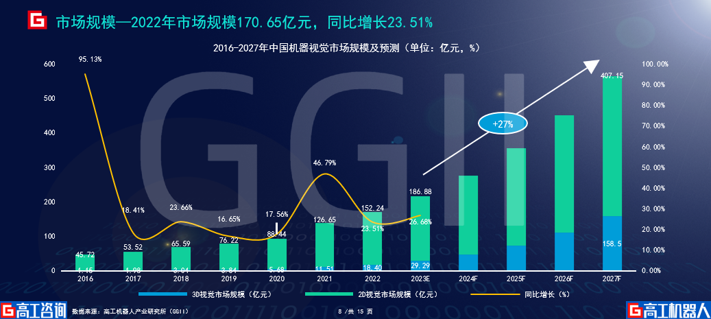 GGII预测,至2027年我国机器视觉市场规模将达到565.65亿元,其中2D视觉市场规模将达到407.15亿元,3D视觉市场规模将达到158.5亿元。目前我国机器视觉在工业场景中的总体渗透率仍旧在10%以下,对比工业场景庞大的体量而言,机器视觉行业仍有较大发展空间。