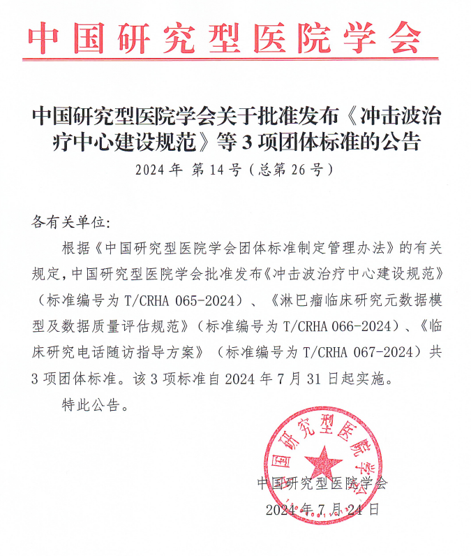 2024年7月26日,中国人民解放军总医院第三医学中心的邢更彦教授联合国内25家单位专家共同撰写的冲击波领域的团体标准《冲击波治疗中心建设规范》团体标准由中国研究型医院学会正式发布。
