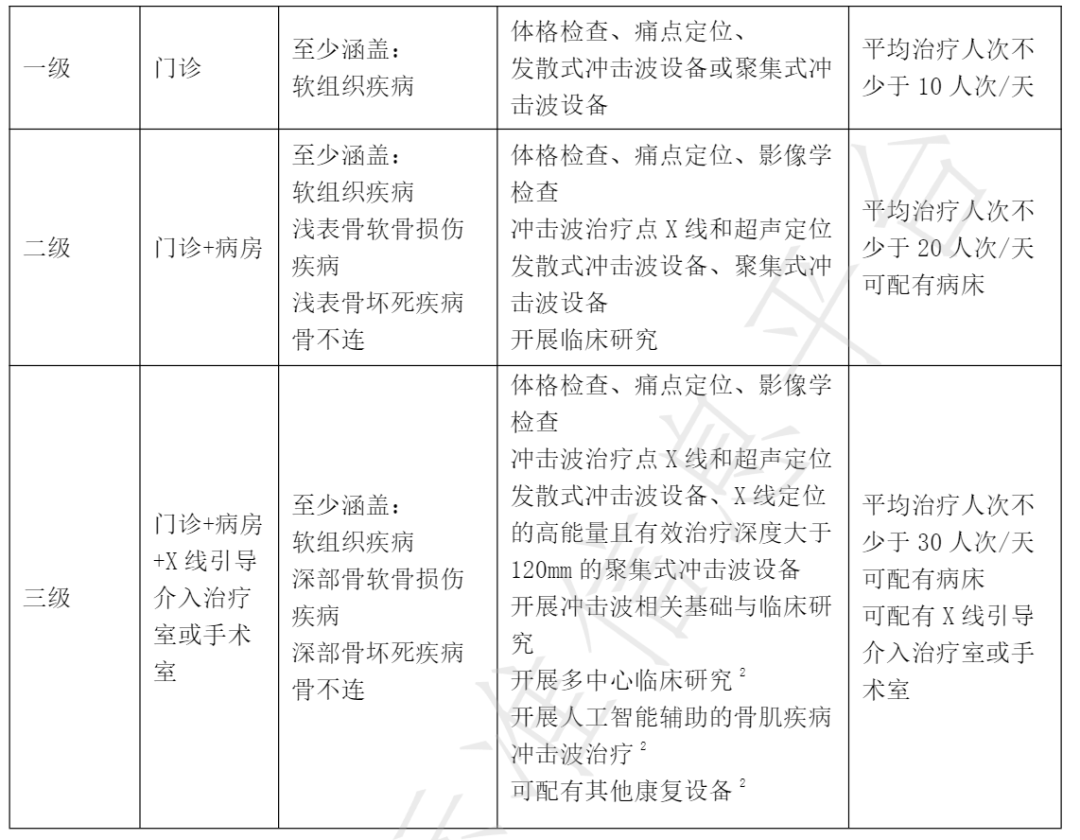 本团体标准将冲击波治疗中心分为三级,针对不同级别中心的医疗区域、治疗范围、核心能力及设备、开展治疗病人量做了具体要求与量化指标。不仅有助于医院设计冲击波中心建设和发展,还有利于患者接受冲击波治疗的分级诊疗。
