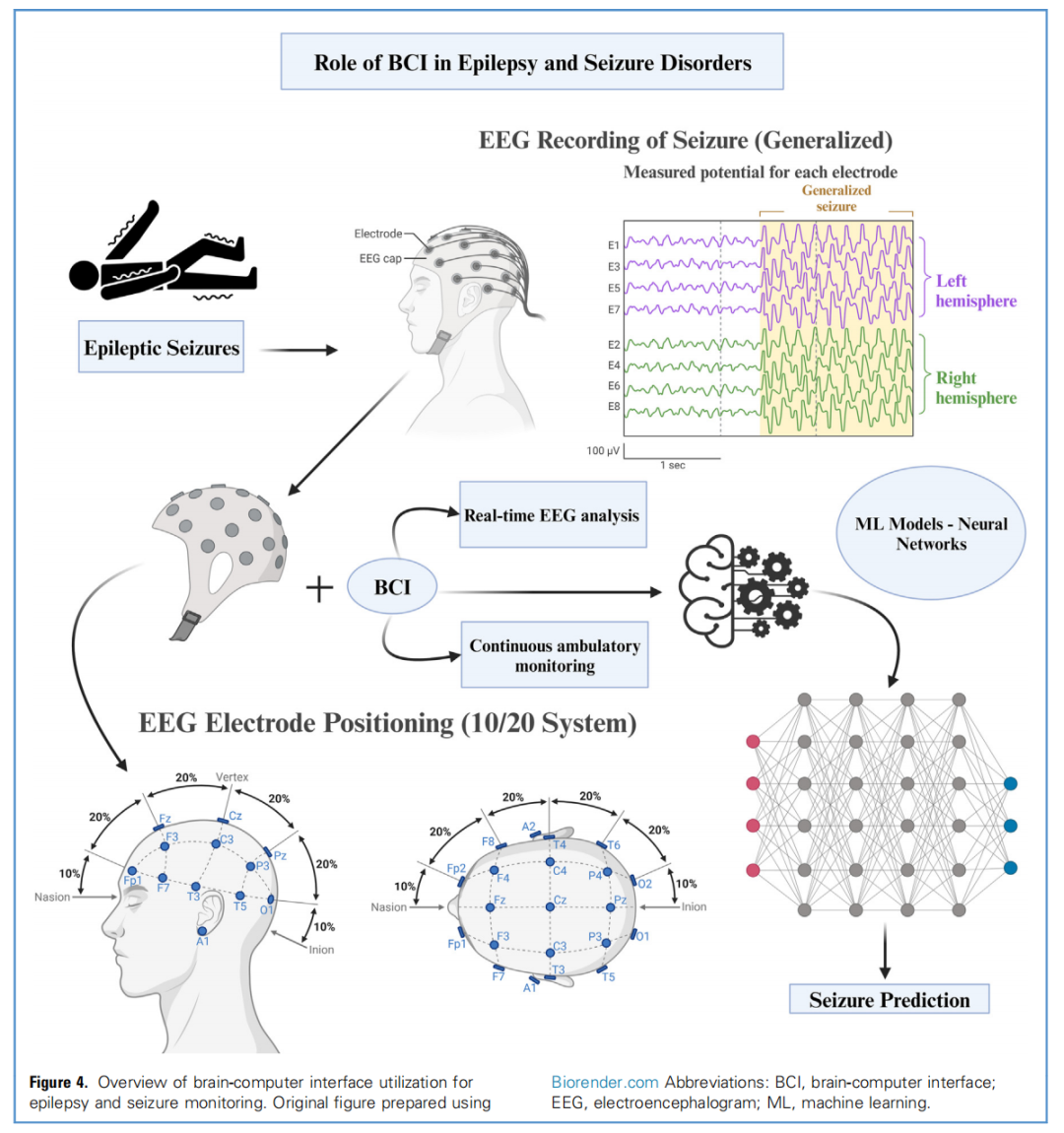 总而言之,如下图所示,在癫痫中使用BCI技术可以实时捕获和分析脑电图数据,从而通过机器学习算法实现癫痫发作预测。