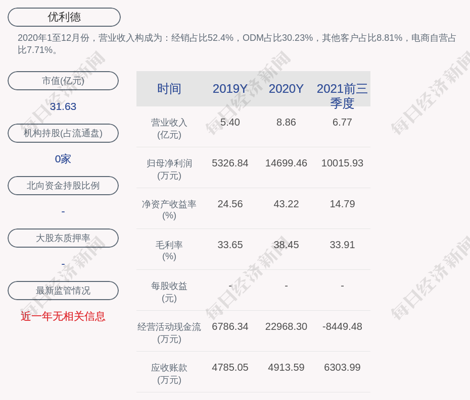 2020年1至12月份,优利德的营业收入构成为:经销占比52.4%,ODM占比30.23%,其他客户占比8.81%,电商自营占比7.71%。