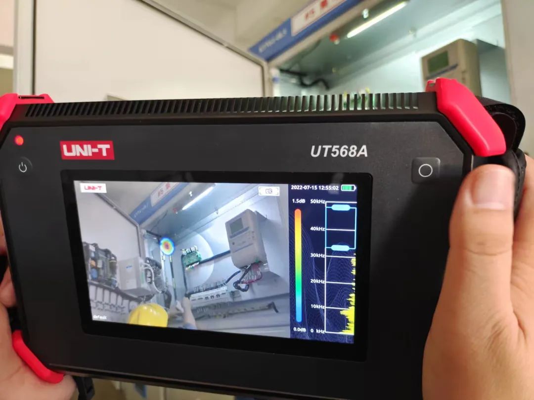 UT568A声学成像仪支持超声波频段,利用麦克风阵列波束形成技术获取声源分布数据,并配合高清摄像头实时采集视频画面,通过将声源分布数据同视频图像进行声像融合,把变化的声源动态地呈现在显示屏上。