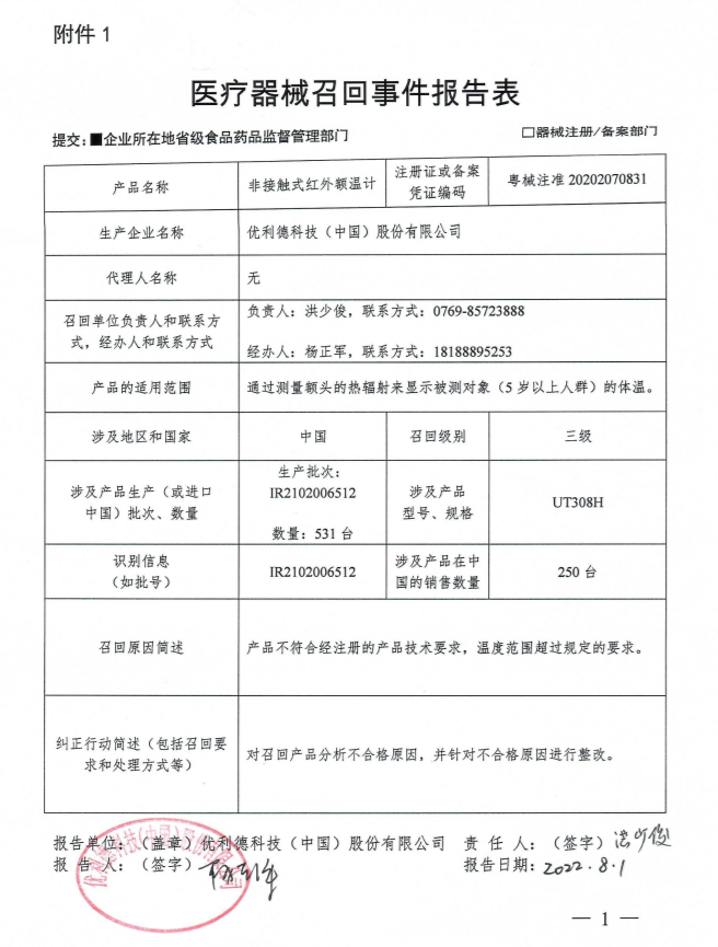 据了解,优利德科技(中国)股份有限公司生产的非接触式红外额温仪,生产批号为IR2102006512,经检查发现该批次产品不符合经注册的产品技术要求,温度范围超过规定的要求。优利德科技(中国)股份有限公司决定发起主动召回。召回在中国的数量为250台。