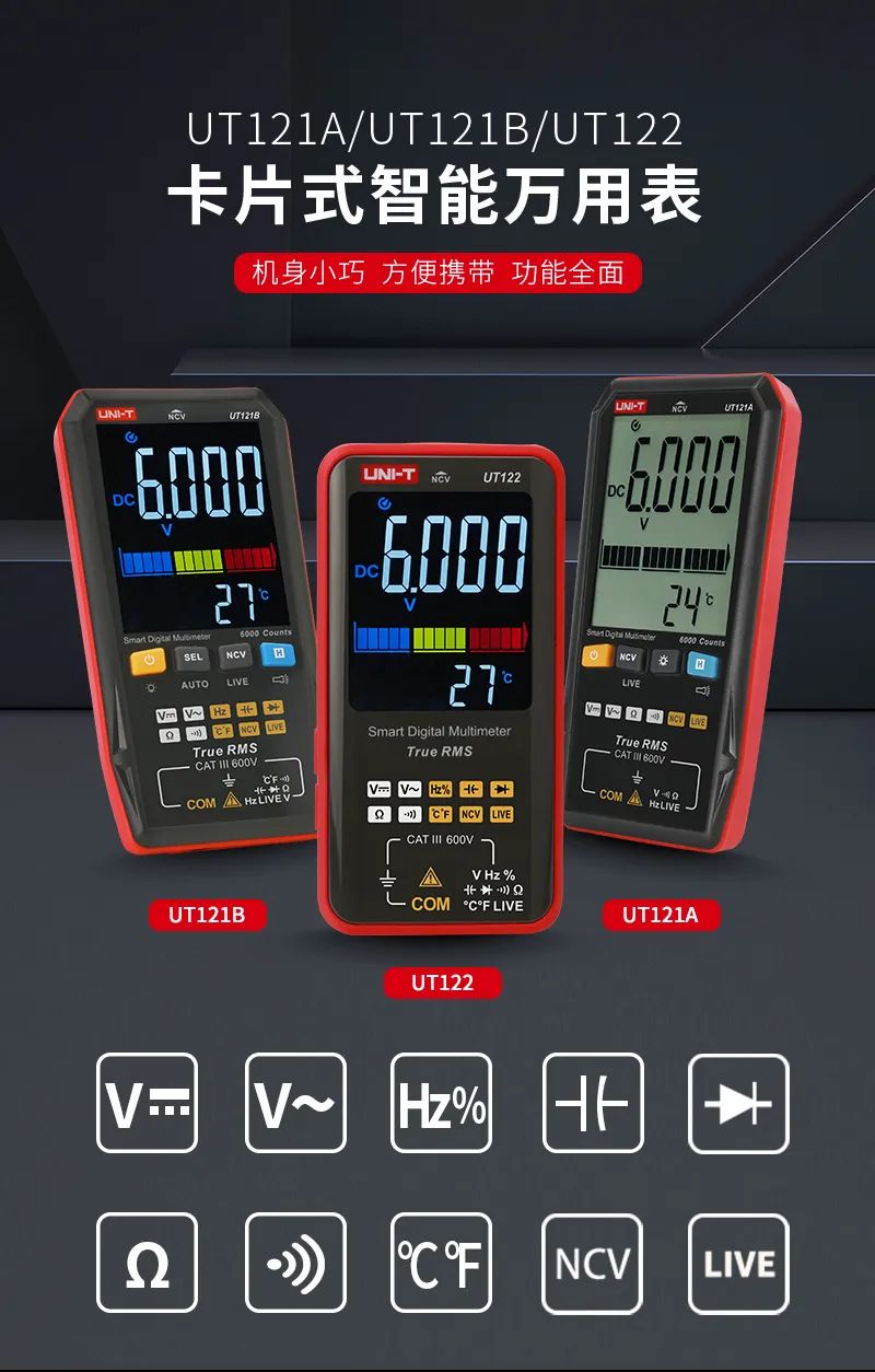 UT121A/UT121B/UT122是一款卡片式自动智能万用表。外观设计时尚轻薄,可轻松装入口袋,实现轻装作业,随时随地想测就测。操作简单,开机即用,电压、电阻和熔断自动量程无需换档,同时还支持手动切换,让您测量起来效率翻翻。