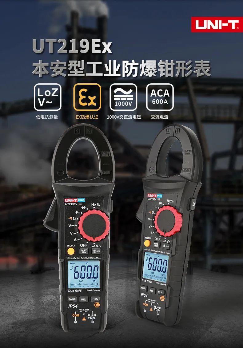 UT219Ex本安型工业防爆钳形表是一款可用于IIC(气体) 2区以及IIIC(粉尘) 22区的本质安全型手持式工业数字钳形表,35mm钳口设计,易于伸入狭窄线缆之间,助您轻松测量,排除故障。