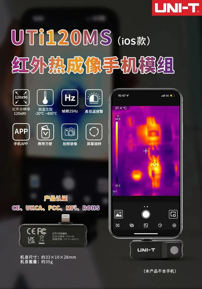 UTi120MS是一款专为苹果用户设计的具备120*90红外像素的热成像手机模组,配合手机APP秒变『口袋热像仪』。机身小巧便携,随接随用,助您轻松探测目标物体的温度,快速发现其中隐藏问题。
