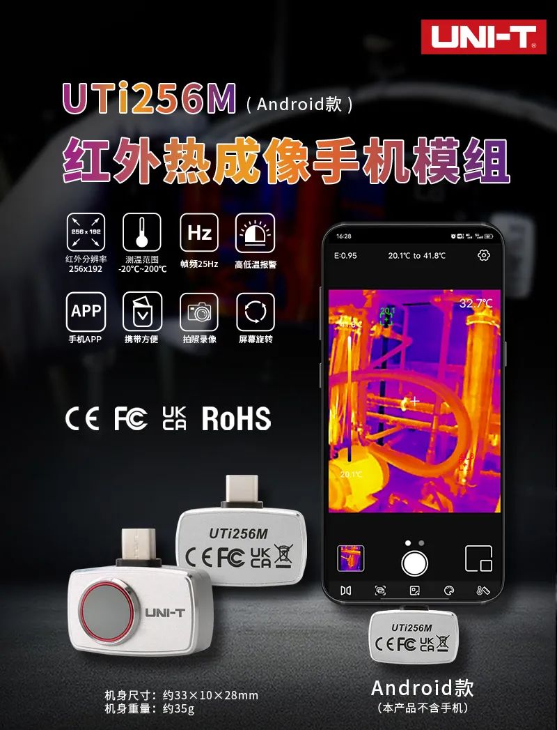 UTi256M是一款专为安卓用户设计的具备256*192红外像素的热成像手机模组,配合手机APP秒变热像仪。体型小巧便携,支持25Hz帧频和热插拔连接,即插即用,让您随时随地快速发现隐藏问题。