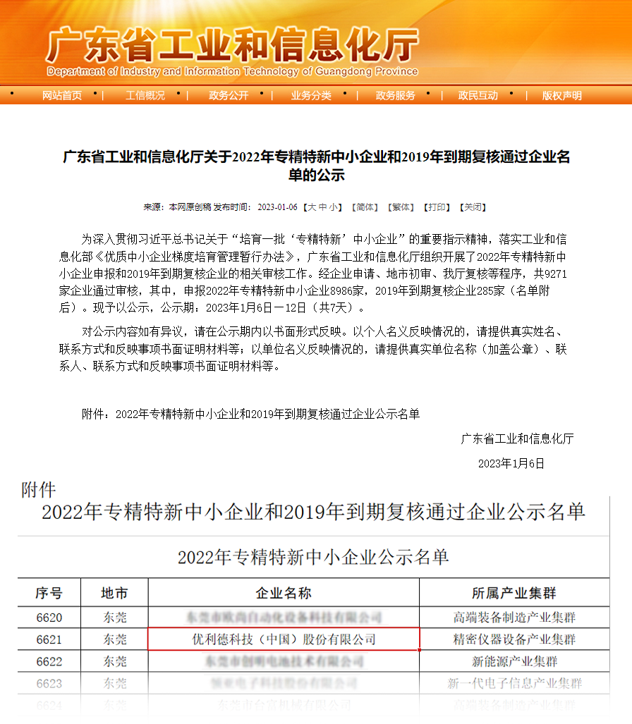 2023年1月6日,广东省工业和信息化厅组织开展的2022年专精特新中小企业申报和2019年到期复核企业的相关审核工作完毕。经企业申请、地市初审、广东省工业和信息化厅复核等程序,现已进入公示阶段。优利德科技(中国)股份有限公司成功列入“2022年专精特新中小企业”。