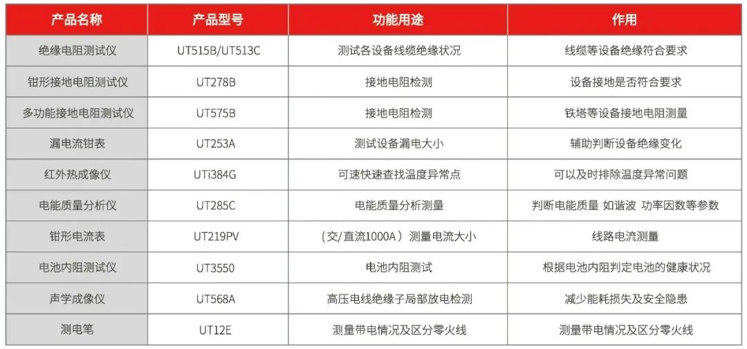 储能电站主要包括储能电池、储能变流器和储能并网柜,优利德针对这三种设备提供了多个专业测试仪器及配套运维解决方案(如下附方案设备清单),可针对储能电站各设备环节进行安全隐患的排查,快速、全方位辨识风险源和安全诱因,将风险消灭于萌芽状态。