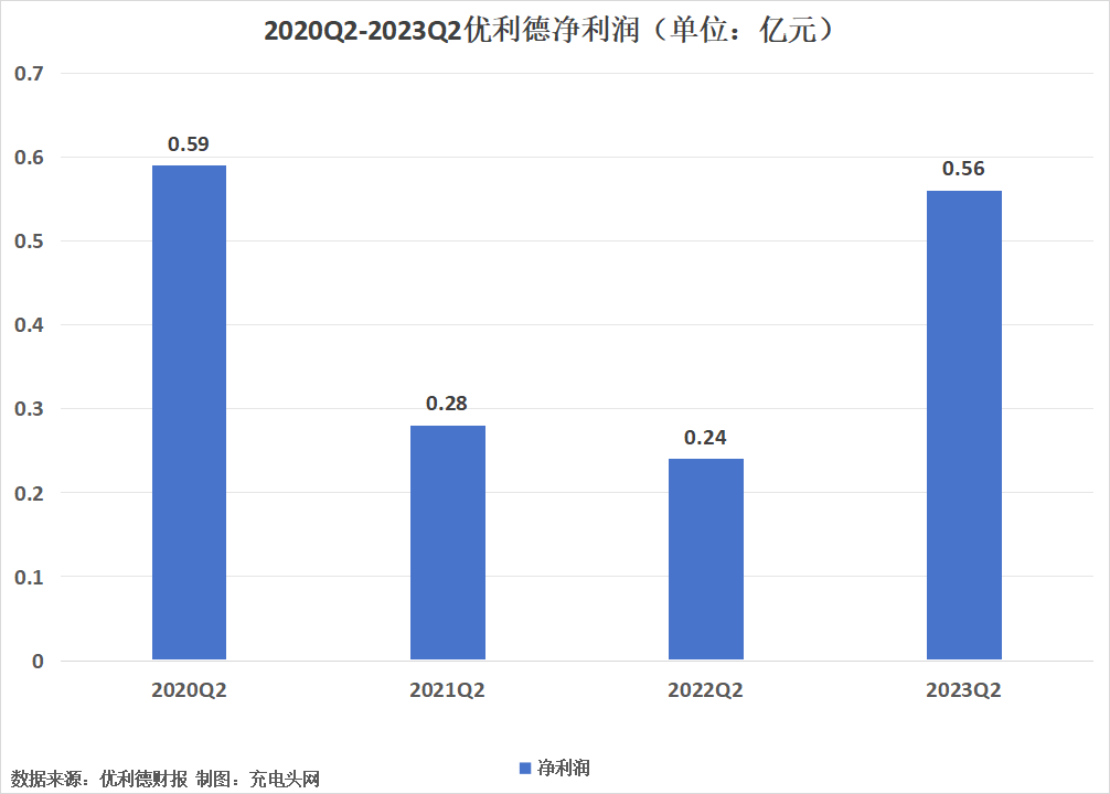 2020-2023年二季度单季度优利德分别实现归母净利润0.59亿元、0.28亿元、0.24亿元、0.56亿元,2021Q2、2022Q2、2023Q2同比变动分别为-52.40%、-15.62%、134.15%。