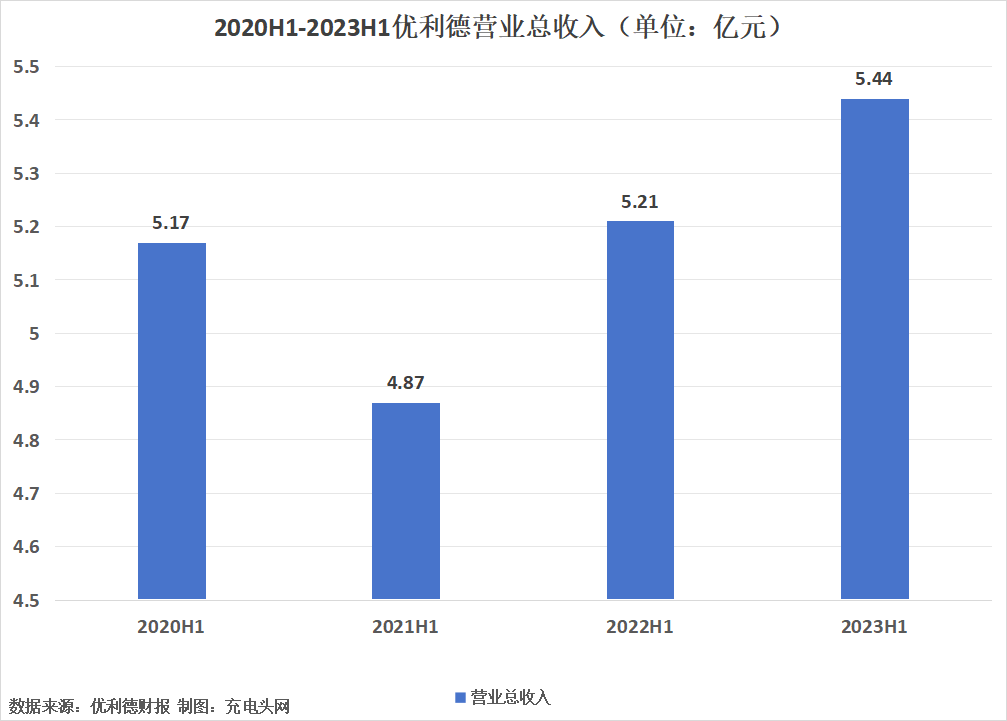 2020-2023年上半年优利德分别实现营业总收入5.17亿元、4.87亿元、5.21亿元、5.44亿元,同比变动分别为99.37%、-5.81%、7.01%、4.51%。
