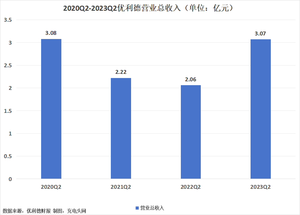 2020-2023年二季度单季度优利德分别实现营业总收入3.08亿元、2.22亿元、2.06亿元、3.07亿元,2021Q2、2022Q2、2023Q2同比变动分别为-27.85%、-7.35%、48.98%。