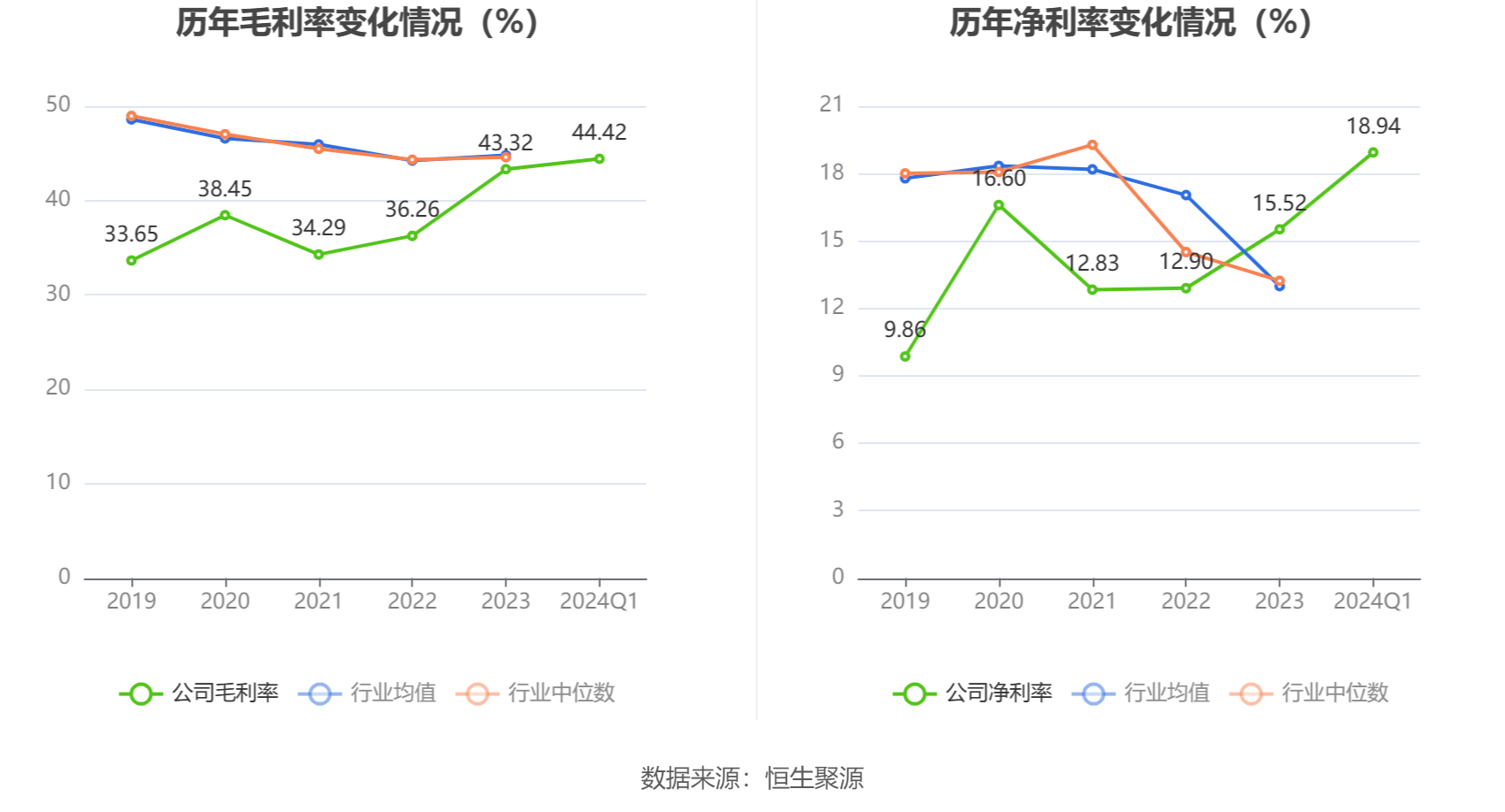 2024年第一季度,公司毛利率为44.42%,同比上升3.14个百分点;净利率为18.94%,较上年同期上升2.01个百分点。