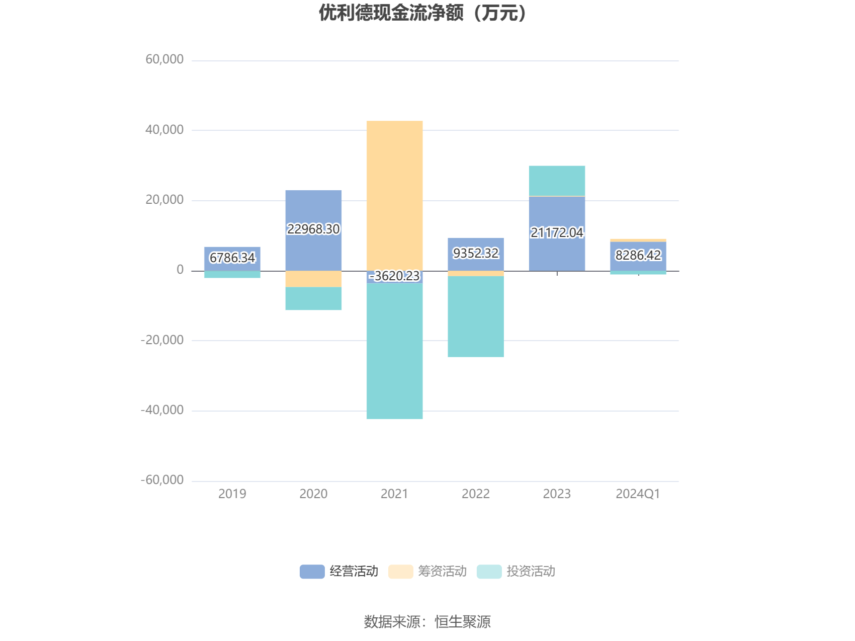 2024年第一季度,公司经营活动现金流净额为8286.42万元,同比下降29.44%,主要系一季度营业收入增加,带来销售商品流入公司的现金增长,支付上年因业务量增加采购的存货货款所致;筹资活动现金流净额792.02万元,同比增加530.44万元;投资活动现金流净额-1056.49万元,上年同期为2.04亿元。