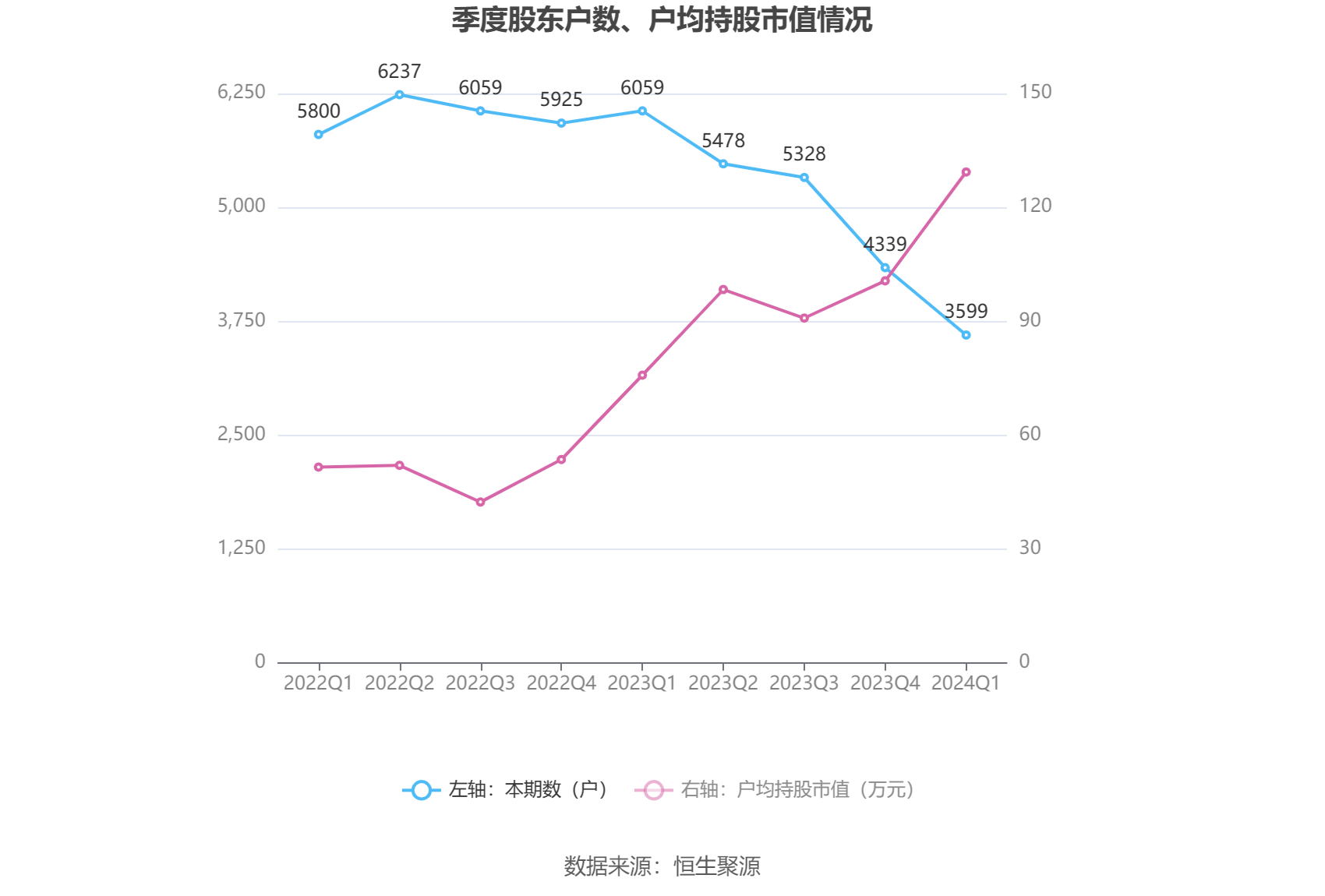 筹码集中度方面,截至2024年一季度末,公司股东总户数为3599户,较上年末下降了740户,降幅17.05%;户均持股市值由上年末的100.65万元上升至129.32万元,增幅为28.48%。