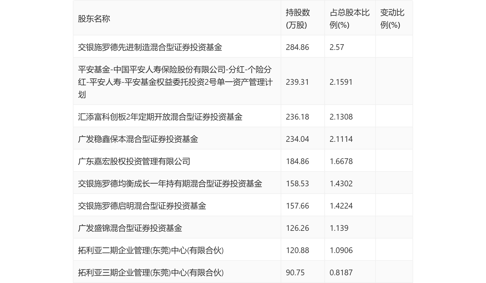 一季报显示,2024年一季度末公司十大流通股东中,新进股东为拓利亚二期企业管理(东莞)中心(有限合伙)、拓利亚三期企业管理(东莞)中心(有限合伙),取代了上年末的平安优势回报1年持有期混合型证券投资基金、民生加银鑫喜灵活配置混合型证券投资基金。在具体持股比例上,交银施罗德先进制造混合型证券投资基金、汇添富科创板2年定期开放混合型证券投资基金、广发稳鑫保本混合型证券投资基金、交银施罗德均衡成长一年持有期混合型证券投资基金、交银施罗德启明混合型证券投资基金持股有所上升,平安基金-中国平安人寿保险股份有限公司-分红-个险分红-平安人寿-平安基金权益委托投资2号单一资产管理计划持股有所下降。