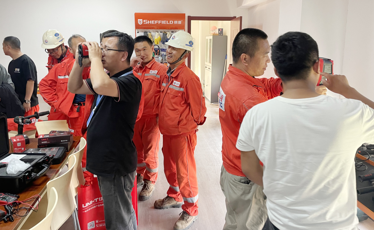在工机具管理中心,优利德团队系统地介绍了公司的概况、技术积淀以及核心产品线,并对多款自主研发的测试仪表进行了全面宣讲。这些产品主要包括UT117C高精度真有效值专业万用表、UTi640J智能型红外热成像仪、UT25CL手持式线缆探测仪、UT334G+泵吸式四合一气体检测仪、UTi260V红外热成像仪、UT352声级计、UT216C数字钳形表以及UT502A绝缘电阻测试仪等。它们以其高精度、高稳定性和智能化特点,得到了与会技术人员的好评与认可。