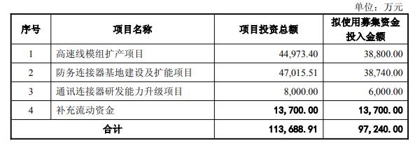 华丰科技2025年11月28日发布的2025年度向特定对象发行A股股票预案(修订稿)显示,本次向特定对象发行股票募集资金总额不超过人民币97,240.00万元(含本数),扣除相关发行费用后的募集资金净额拟用于以下项目:高速线模组扩产项目、防务连接器基地建设及扩能项目、通讯连接器研发能力升级项目、补充流动资金。