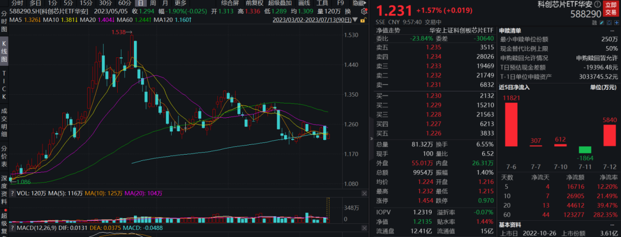 截至9:57,科创芯片ETF华安(588290)盘中持续攀升,现已涨1.57%。成交额9954万,成交额持续扩大,换手率6.55%,市场交投活跃。