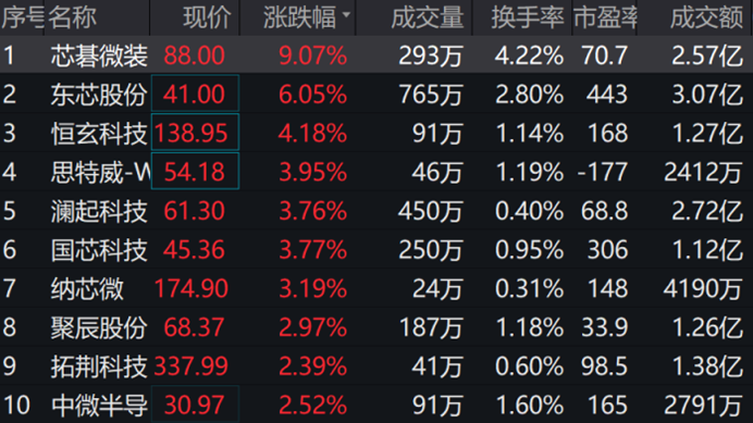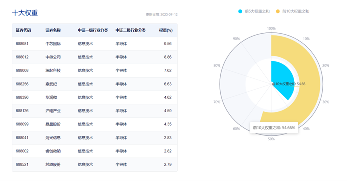 截至2023年7月12日,该指数前十大权重股包括中芯国际、中微公司、澜起科技、寒武纪、华润微、沪硅产业等,前十大权重股合计占比54.66%。(数据来源:中证指数公司,指数成份股不代表个股推荐)