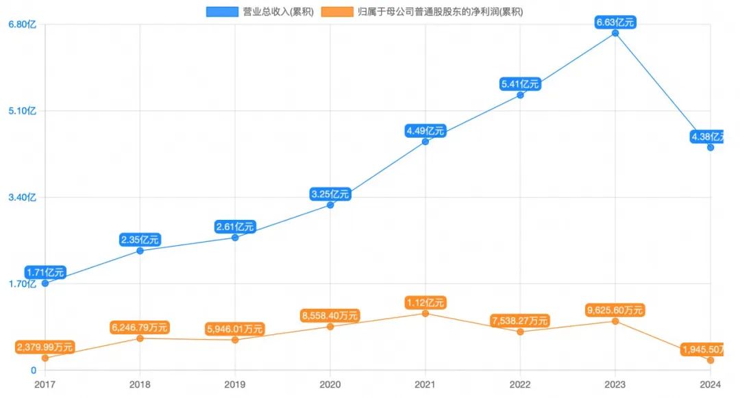 自2017年以来,公司营收规模不断扩大,由1.71亿元一路上涨至2023年的6.63亿元,累计增长约288%。