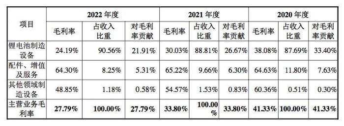 2020年、2021年和2022年,誉辰智能的锂电池制造设备业务的营收分别是1.779亿元、3.315亿元、6.458亿元,占比分别是87.69%、88.81%、90.56%。配件、增值及服务业务的营收占比在2022年仅为8.26%,其他领域制造设备的营收占比为1.18%。因此锂离子电池制造设备业务是该公司的绝对核心业务。