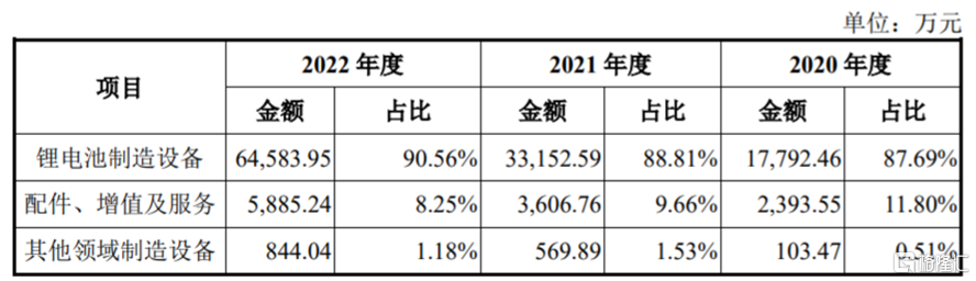 公司主要产品为锂离子电池智能制造装备与消费电子类智能制造设备,可广泛运用于新能源、汽车电子、消费电子等多领域产品的智能生产制造,是实现生产自动化、智能化和高效化的关键装备。报告期内,公司80%以上的收入来自锂电池制造设备。