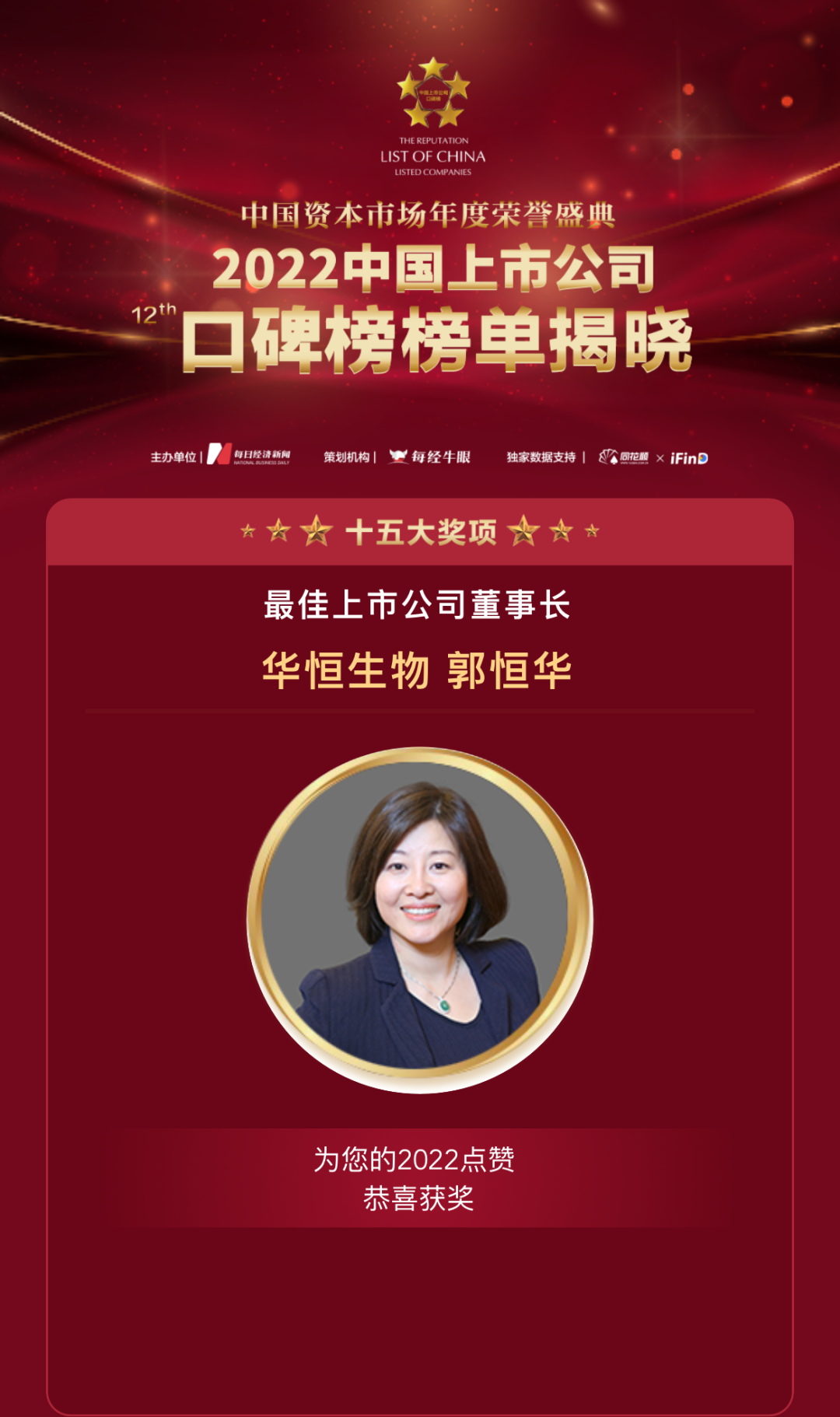 12月28日,由每日经济新闻主办的“2022中国上市公司口碑榜”评选结果正式出炉。作为华恒生物的“模范奋斗者”,凭借带领华恒生物以发展绿色合成生物技术,助力国家低碳减排的卓越表现,华恒生物董事长、总经理郭恒华女士荣获“2022第十二届中国上市公司口碑榜”之“最佳上市公司董事长”奖项。