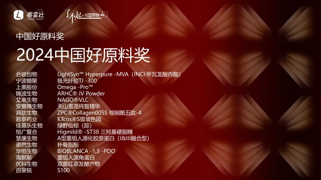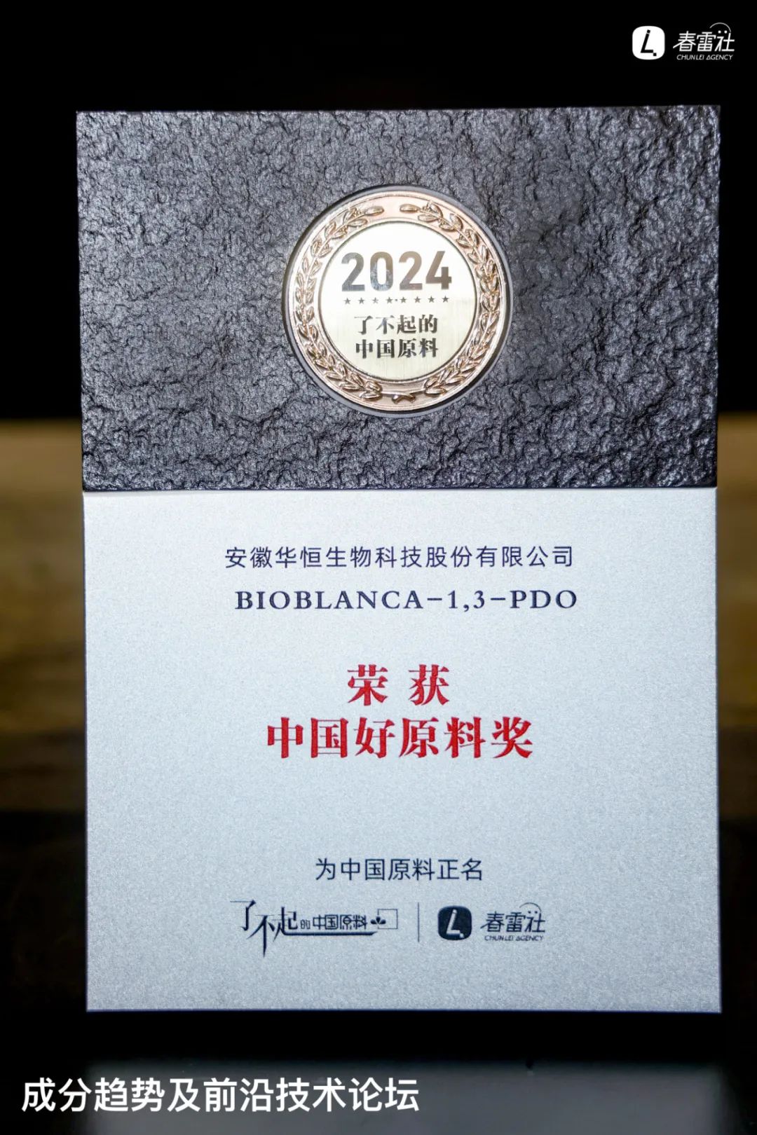 12月26日,经过激烈的角逐,华恒生物BIOBLANCA?1,3-PDO在超过200款参赛原料中脱颖而出,荣获春雷社「了不起的中国原料」评选大赛「中国好原料奖」。这是BIOBLANCA?1,3-PDO相继获得荣格技术创新奖、INPD国际创新原料奖之后,在美妆原料科技创新领域斩获的又一重磅荣誉。