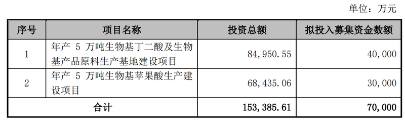 据新京报贝壳财经记者不完全梳理,2022年10月,华恒生物发布2022年度向特定对象发行A股股票预案,募集资金总额不超过17.27亿元(含本数),均为现金认购。扣除发行费用后的净额将用于年产5万吨生物基丁二酸及生物基产品原料生产基地建设项目,拟投入募集资金7.58亿元;年产5万吨生物基苹果酸生产建设项目,拟投入募集资金6.7亿元;补充流动资金,拟投入募集资金3亿元。