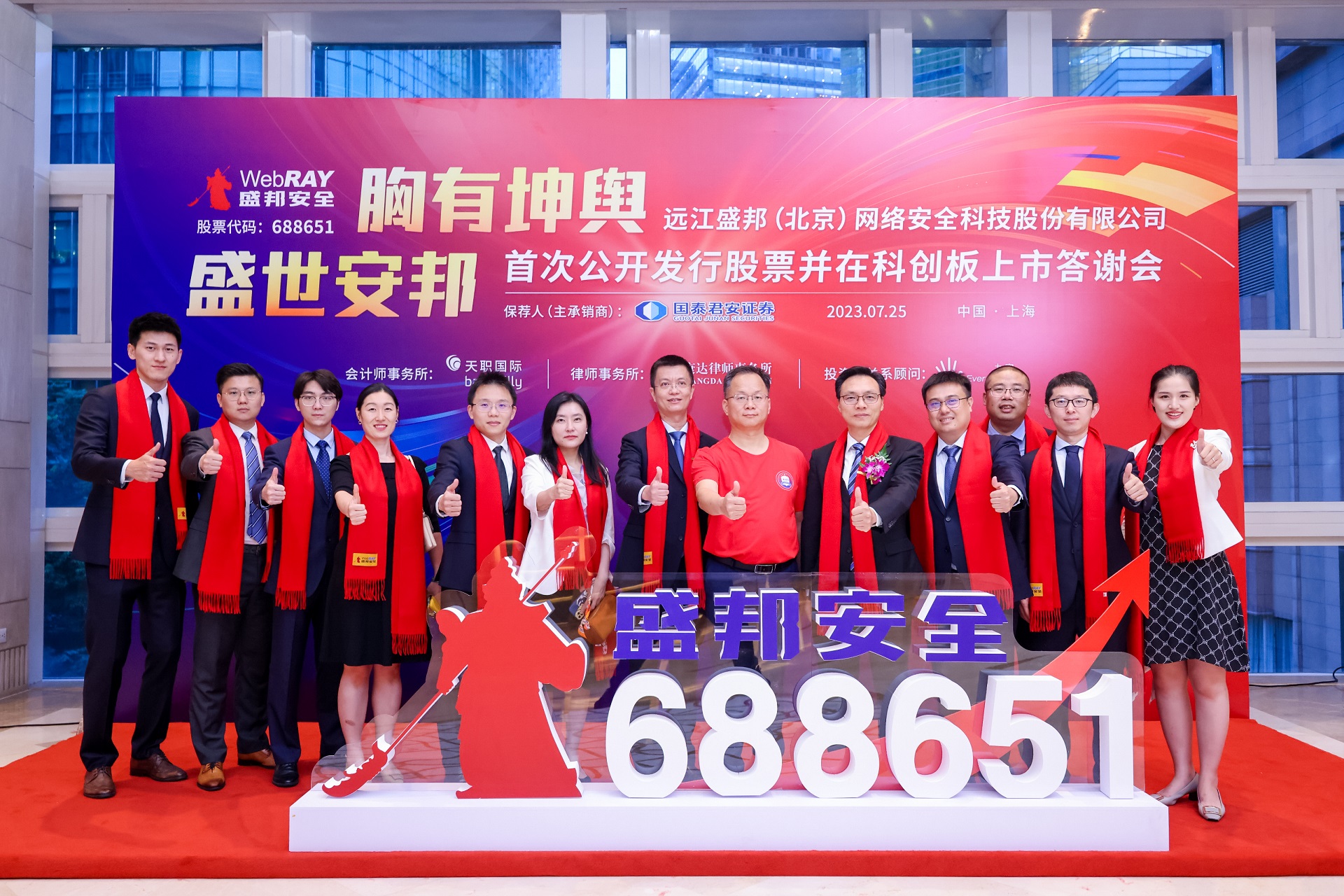 7月26日,远江盛邦(北京)网络安全科技股份有限公司(简称“盛邦安全”,688651.SH)?次公开发?股票并正式登陆上交所科创板,募集资金总额7.53亿元。国泰君安担任独家保荐机构及主承销商。助力盛邦安全成功登陆科创板,充分展现了公司深耕网络安全?业、致?于陪伴“专精特新”企业发展壮大的决心和努力。