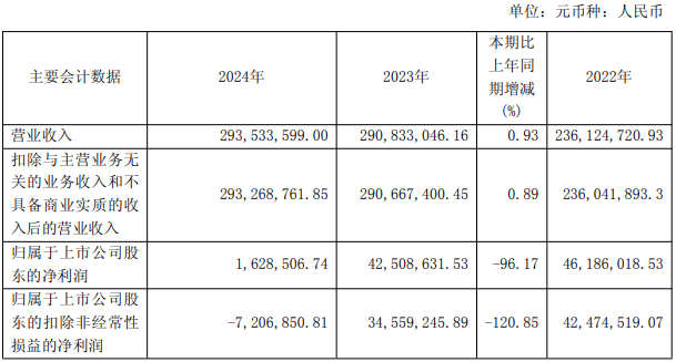 2024年,公司营业收入2.94亿元,同比增长0.93%;归属于上市公司股东的净利润162.85万元,同比减少96.17%;归属于上市公司股东的扣除非经常性损益的净利润-720.69万元,上年同期为3455.92万元;经营活动产生的现金流量净额-6338.67万元,上年同期为-1068.22万元。
