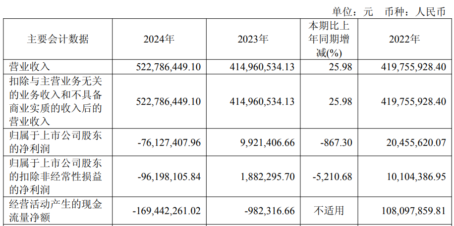 康希通信(688653.SH)4月30日披露2024年年度报告。2024年,公司实现营业收入5.23亿元,同比增长25.98%;归属于上市公司股东的净利润为-7612.74万元,上年同期为992.14万元;归属于上市公司股东的扣非净利润为-9619.81万元,上年同期为188.23万元;经营活动产生的现金流量净额为-1.69亿元,上年同期为-98.23万元。