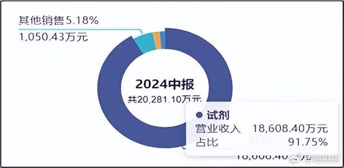 2024年上半年,公司试剂业务收入占比约为91.75%,其他销售业务占比约为5.18%,试剂业务是公司的主要收入来源。