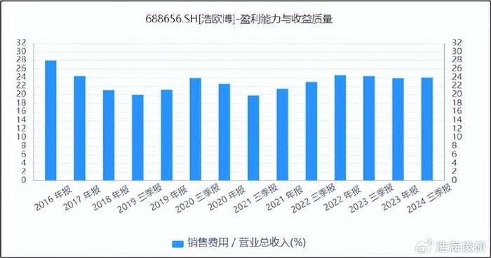 一、高营销。体外检测行业竞争激烈,企业需投入大量费用,进行市场推广、客户维护和产品宣传等,以提升产品的知名度和市场占有率。因此,高营销投入,是行业的通病,浩欧博当然也不例外。历史数据显示,浩欧博的销售费用占比稳定维持在25%左右的区间内。