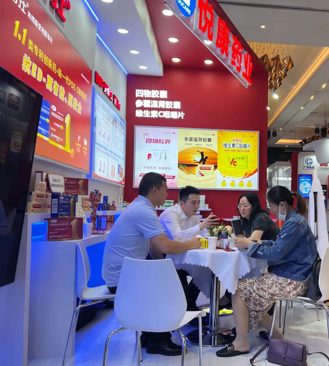 悦康药业展台现场吸引了众多来自全国各地的上下游客户莅临交流与洽谈。其中,全国百强连锁一心堂药业董事长阮鸿献先生莅临展位深入交流,百强连锁漱玉平民大药房连锁有限公司副总裁秦总,更是对集团产品进行了详细了解,尤其对爱地那非、通脉降脂颗粒、维生素C咀嚼片、参藿温肾胶囊等产品表达了极大的兴趣,她认为悦康集团产品质量好,产品终端需求大,产品差异化优势强,可填补门店的品类空缺,愿意与集团进行进一步合作。