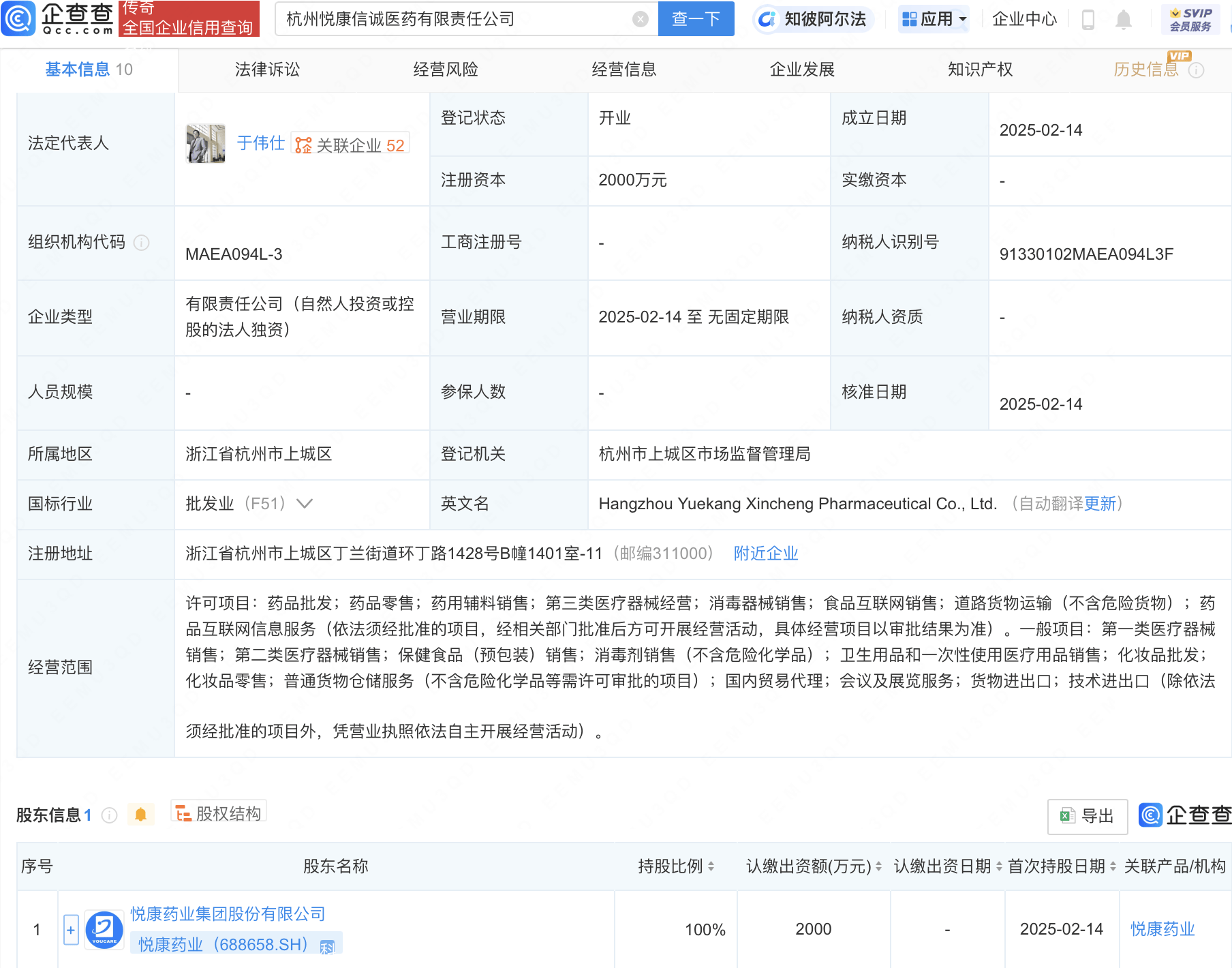 近日,杭州悦康信诚医药有限责任公司成立,法定代表人为于伟仕,注册资本2000万元,经营范围包含:消毒器械销售;食品互联网销售;化妆品批发;化妆品零售等。股权穿透显示,该公司由悦康药业(688658)全资持股。