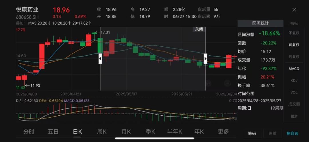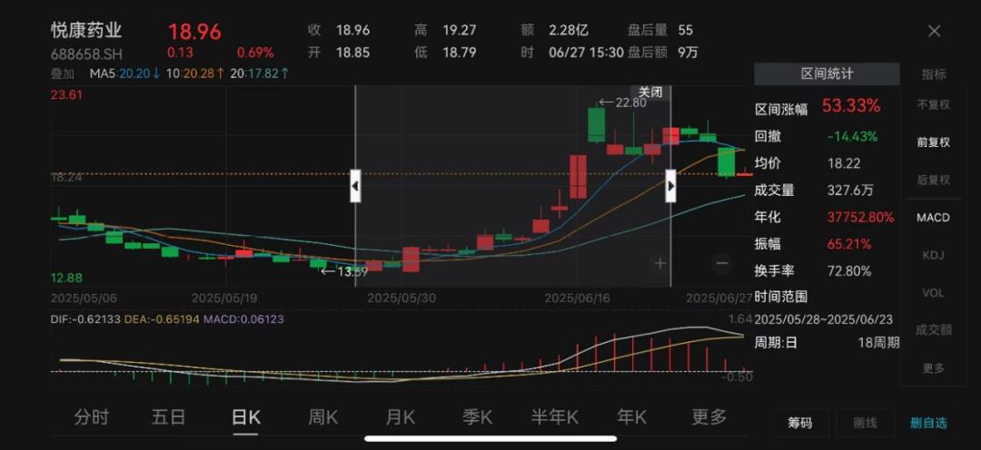 一拍流拍后,悦康药业股价迅速上涨。自5月28日至6月23日,该股累计上涨超53%,一度涨幅达到76%,期间成交量显著放大,单日成交额最高突破7亿元。