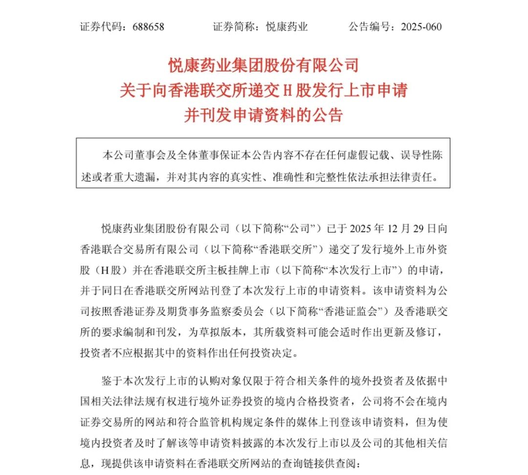 近日,悦康药业(688658.SH)发布公告,宣布已向港交所递交主板上市申请,正式启动港股上市进程,有望成为A+H双资本平台驱动的本土创新药企。