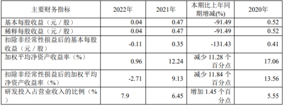 2022年,元琛科技基本每股收益为0.04元/股,同比下降91.49%;加权平均净资产收益率为0.96%,同比减少11.28个百分点;扣除非经常性损益后的加权平均净资产收益率为-2.71%,同比减少11.84个百分点。