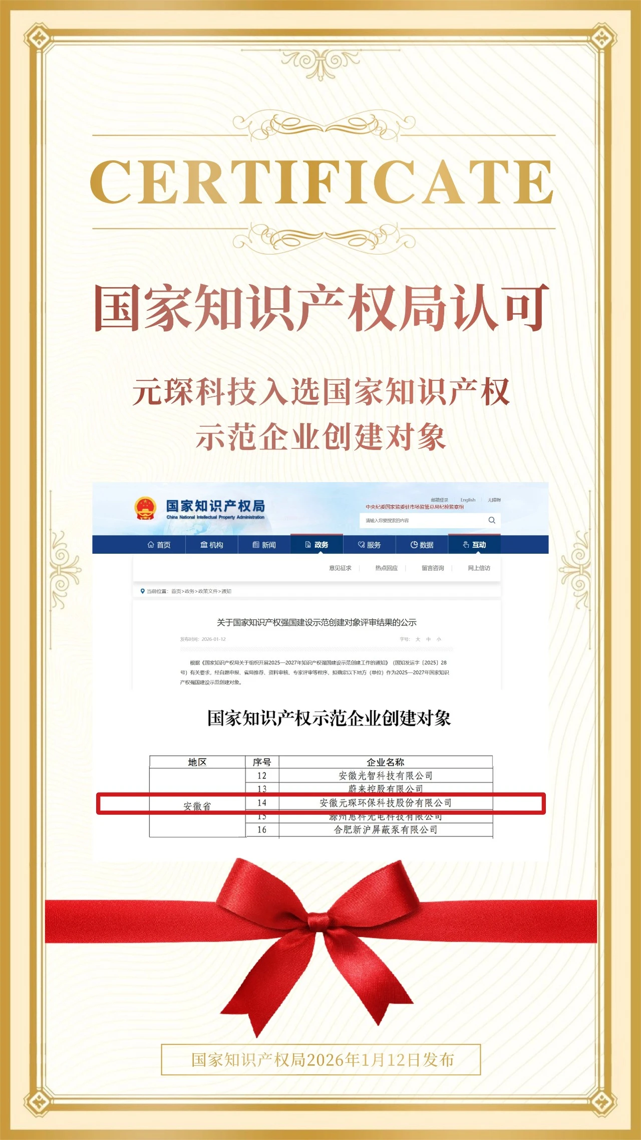 近日,国家知识产权局公布“国家知识产权强国建设示范创建对象名单”,元琛科技凭借扎实的专利积累与创新能力,成功获评“国家知识产权示范企业创建对象”,成为引领区域创新发展的标杆企业。 当前,我国正从知识产权引进大国向创造大国转变。知识产权已成为推动高质量发展、实现科技自立自强的重要战略支撑。在这个过程中,元琛科技始终立足产业一线,将创新作为企业发展的核心动力,围绕关键领域展开系统化专利布局与技术储备,形成了一批具有自主知识产权的核心技术,并通过构建涵盖管理、保护、运营与转化的全链条工作机制,推动知识产权从“数量优势”向“价值优势”转变。 此次评选中,安徽省共有57家企业脱颖而出,成为国家知识产权示范创建的先锋。元琛科技衷心祝贺其余56家优秀同行,致敬每一份创新力量。 下一步,元琛科技将继续深化知识产权战略与创新体系的融合,强化高质量专利培育与产业应用,与全省优秀企业携并肩手,合力打造立足安徽、辐射全国的科技高地与产业创新共同体,以系统性创新支撑产业升级,共同书写知识产权强国的创新篇章。
