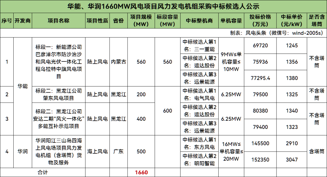 1月23日、24日华能巴彦淖尔市风电光伏一体化工程等3个风电项目、华润阳江三山岛四海上风电场项目风力发电机组及其附属设备采购中标候选人公示,项目规模总计1660MW,单机容量为6.25MW-20MW。