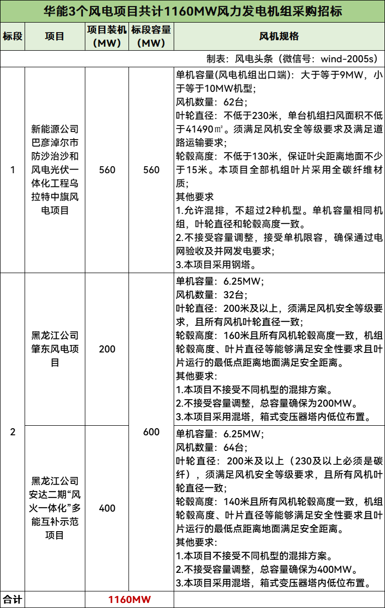 华能新能源公司巴彦淖尔市风电光伏一体化工程等3个风电项目共计1160MW风力发电机组及其附属设备集中采购预招标,本项目分为2个标段,采购规模1160MW风力发电机组及其附属设备,单机容量6.25MW-10MW。