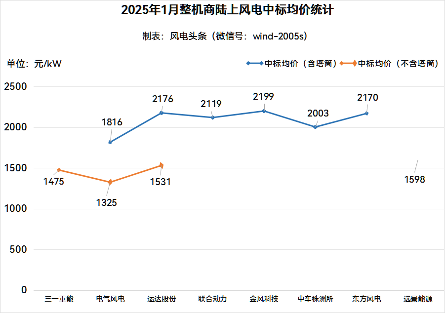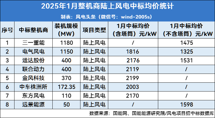 根据风电头条(微信号:wind-2005s)风电项目数据库统计显示,从1月份风电整机商中标均价来看,在陆上风电项目各整机商中,含塔筒最高中标均价为2199元/kW,由金风科技报出。