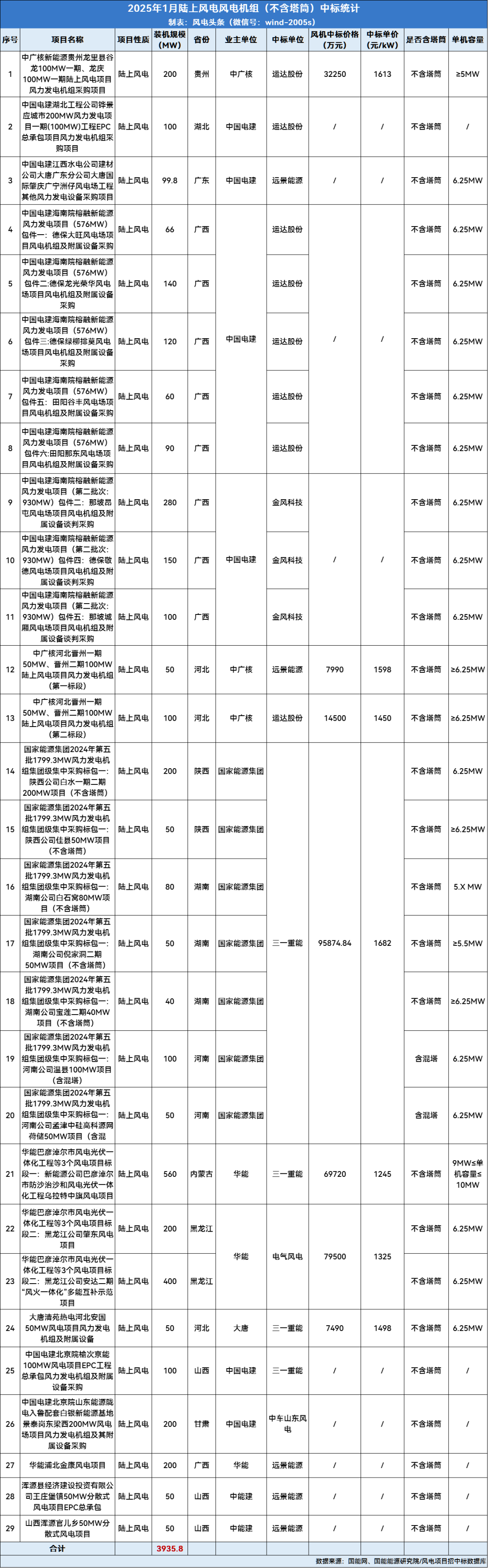 5、从价格方面来看,2025年1月,陆上风电项目:(含塔筒)最低中标单价为1466元/kW,最高中标单价为2750元/kW;(不含塔筒)最低中标单价为1245元/kW,最高中标单价为1682元/kW。海上风电:含塔筒中标单价为2910元/kW。